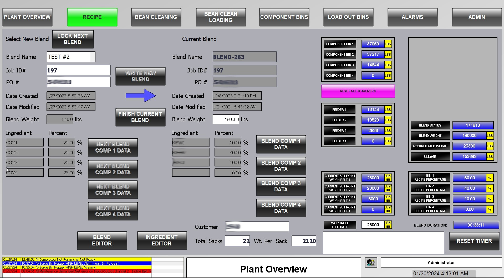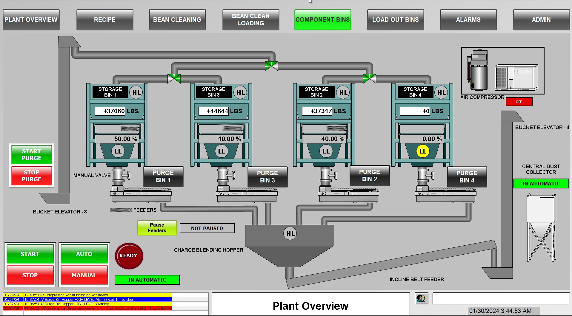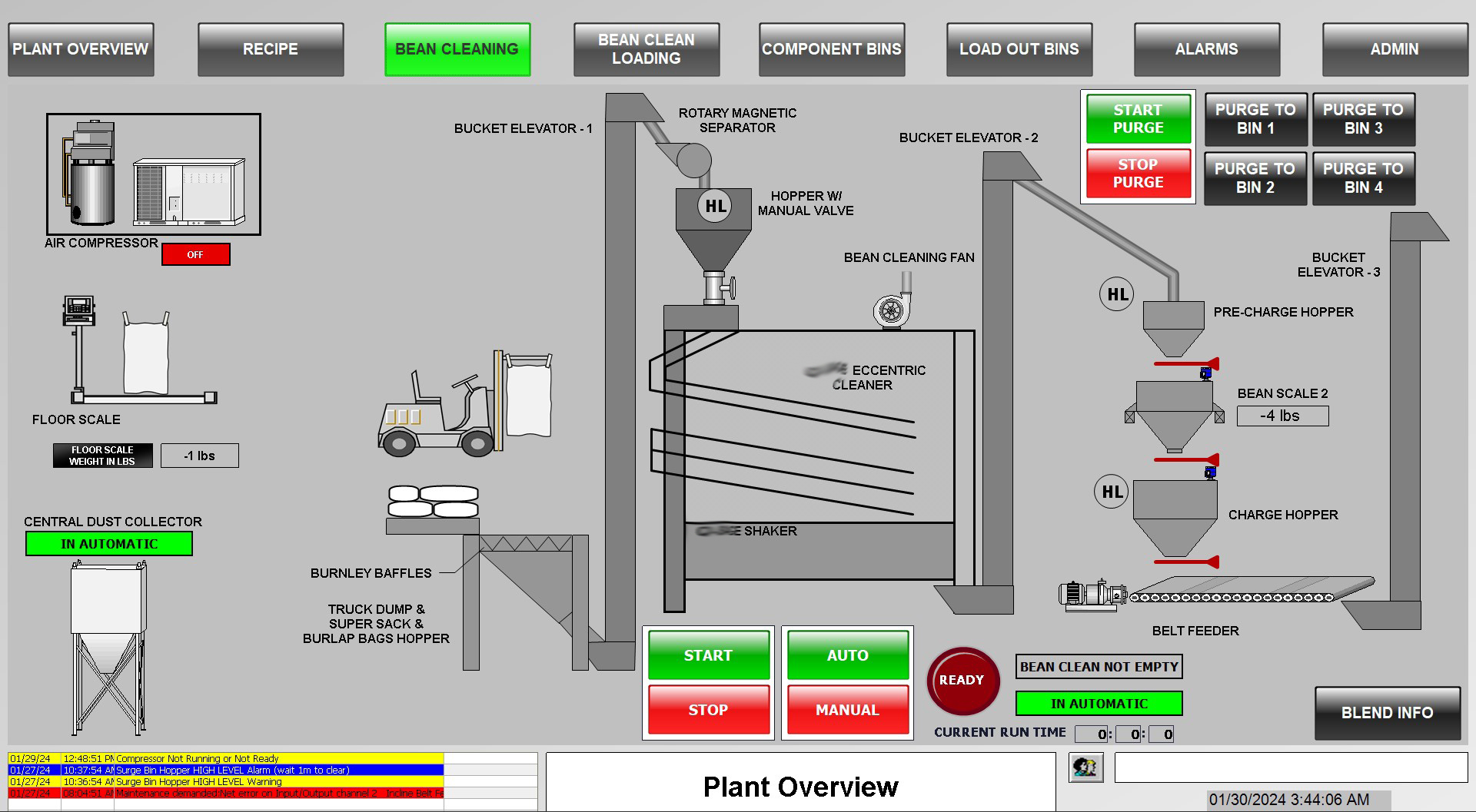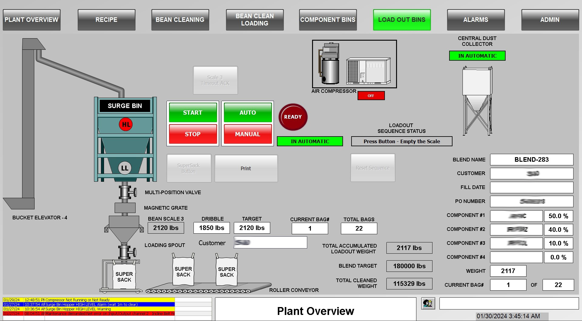 - The blended beans from the feeder go to another silo, where there is a 3-position valve and scale to control the flow and weight that loads into bags of about 1800 lbs each (or desired setpoint). These bag weights are recorded into SQL and a bag label is printed.
