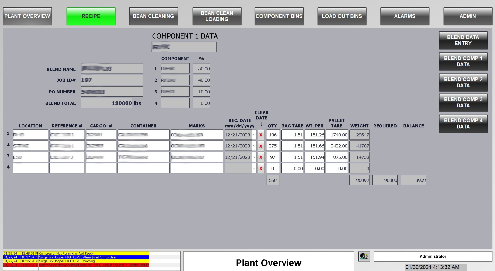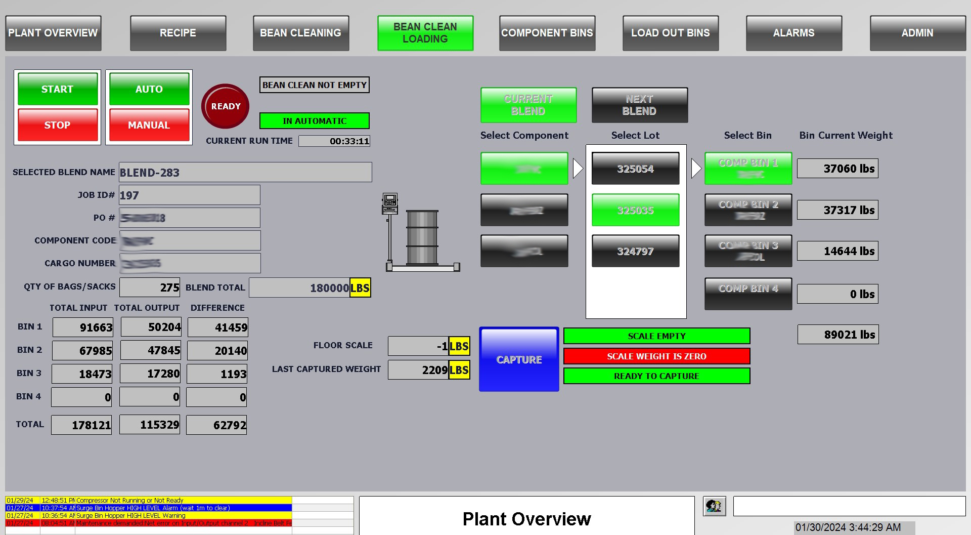 The WinCC Professional application is the “master HMI” which controls entire system, including the coffee bean blend recipe management system, which is stored in SQL database tables. The ingredients are stored in an database table, as well as the recipes for blends that specify the percentages and ingredients for each blend. The recipes are recalled for production, and the destination silo can be chosen just prior to loading and cleaning of the beans. Lot numbers are also used to track the input weight against the output weight to determine the loss of weight after cleaning the outer peels and other waste that were cleaned from the beans. The pre-cleaned weight and post-cleaned weights are stored in the database by ingredient and lot number.